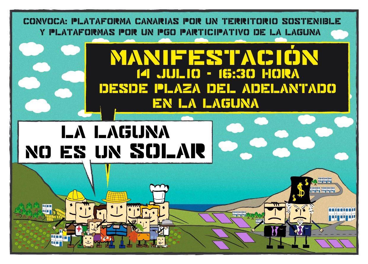 La Plataforma Canaria por un Territorio Sostenible y plataformas por un PGO participativo de La Laguna convocan a una manifestación este jueves 14. La manifestación partirá desde la plaza del Adelantado a las 16.30 horas.
