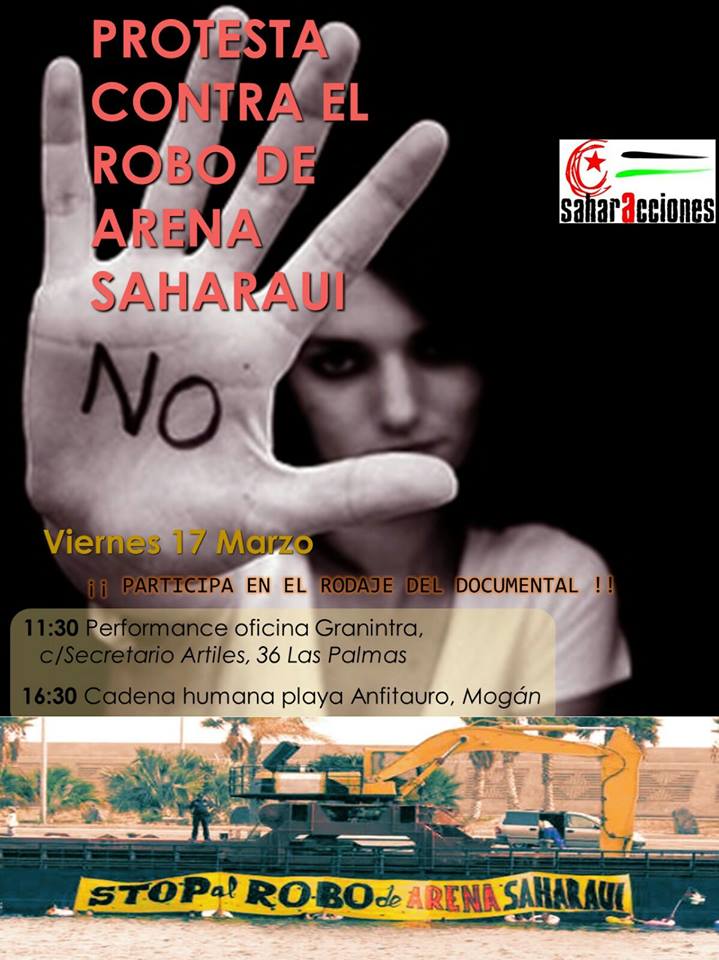 Algunas empresas canarias han participado del saqueo de recursos naturales saharauis y continúan haciéndolo. Esta actividad, después de la sentencia del Tribunal de Justicia Europeo de diciembre pasado, es además de inmoral, delictiva. Para protestar contra estas actividades y la complicidad de las autoridades que las amparan, cuando no promueven, a las 11’30 h. del viernes 17 de marzo nos concentraremos ante la sede de GRANINTRA una de las principales beneficiarias de esta trama. Por la tarde a las 16’30h haremos una cadena humana en la Playa de Anfi Tauro, una de las playas artificiales construidas con las mismas arenas en las que el ocupante marroquí hizo desaparecer a cientos de personas. Te invitamos a que participes en la denuncia del robo de recursos saharauis.
