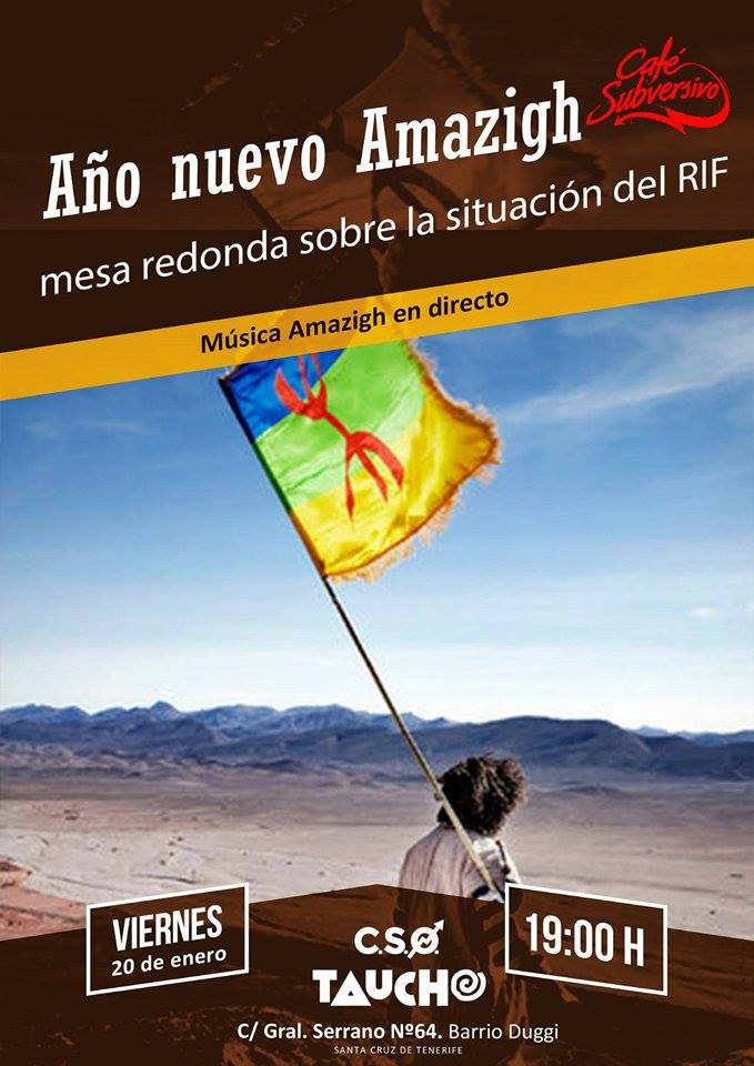 El “Café Subversivo” de este viernes en el CSO Taucho estará dedicado al mundo amazigh. Aprovechando que la semana pasada se celebró el “Año Nuevo Amazigh” o “Yennayer” (12 de enero), se abordará en mesa redonda el conflicto que se vive en estos momentos en el Rif. La actividad, que dará comienzo a las 19:00 horas, contará con actuaciones musicales.