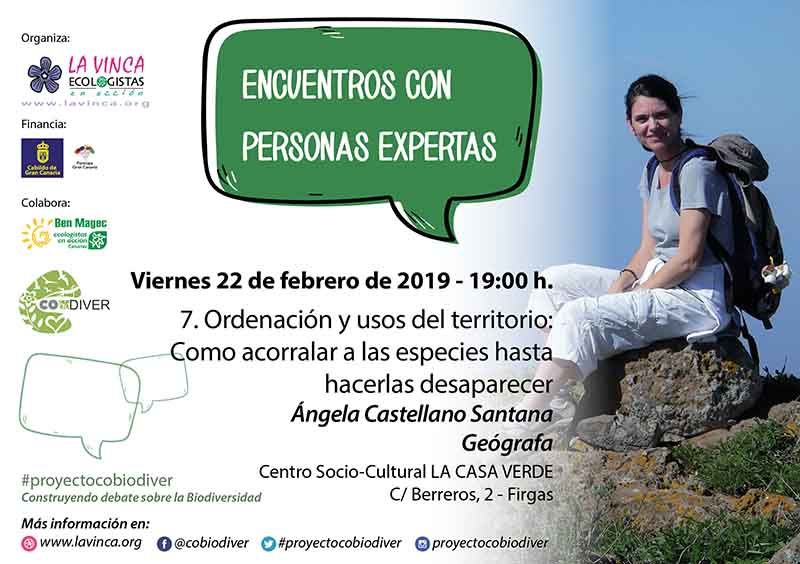 Actividad incluida en el Proyecto “COBIODIVER – Construyendo Debate sobre la Biodiversidad”, organizada por el colectivo LA VINCA Ecologistas en Acción. La quinta de estas sesiones se desarrollará el viernes 22 de febrero de 2019, a las 19.00 horas, en el Centro Socio-Cultural LA CASA VERDE (C/ Los Berreros, nº 2 – Firgas) y se contará como persona EXPERTA en la materia con Ángela Castellano Santana, que hablará sobre Ordenación y usos del territorio: como acorralar a las especies hasta hacerlas desaparecer, con el siguiente formato: