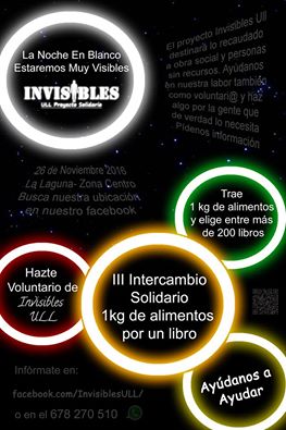 El proyecto Invisibles ULL liderado por estudiantes de la Universidad de la Laguna llevara a cabo por primera vez un intercambio solidario fuera del reciento de la institución Lagunera. Estaremos presentes en la denominada Noche en Blanco que se celebra en San Cristóbal de la Laguna este veintiséis de noviembre estando localizados en el Túnel de Aguere desde las once de la mañana hasta las once de la noche.