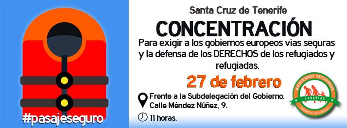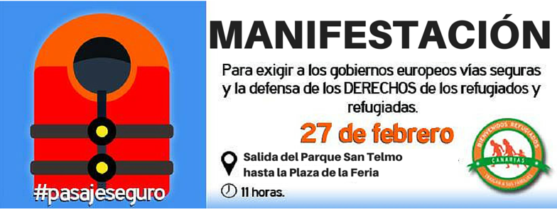El próximo sábado, 27 de febrero, habrá una movilización ciudadana conjunta en toda Europa para exigir a los gobiernos europeos un #PASAJESEGURO y la defensa de los derechos de los refugiados. En Canarias también queremos sumarnos a la convocatoria europea y manifestar nuestro apoyo y defensa de los derechos de los refugiados sean de la nacionalidad que sean.