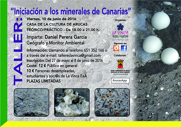 A partir del viernes 27 de mayo se abre el plazo de inscripción para el TALLER: “INICIACIÓN A LOS MINERALES EN CANARIAS» y las personas interesadas en asistir al mismo pueden inscribirse llamando al teléfono 651 352 166 (Comisión de Formación de La Vinca EeA).