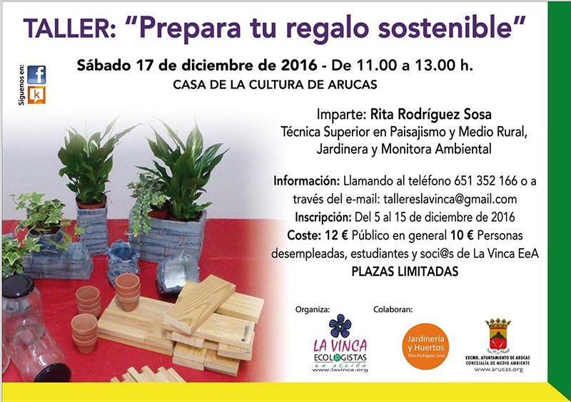 El coste de dicho Taller es de 12 €, para público en general, y de 10 € para desempleados y socios/as de LA VINCA EeA. El Taller se realizará en la Casa de la Cultura de Arucas, en horario de 11.00 a 13.00 horas el sábado 17 de diciembre.