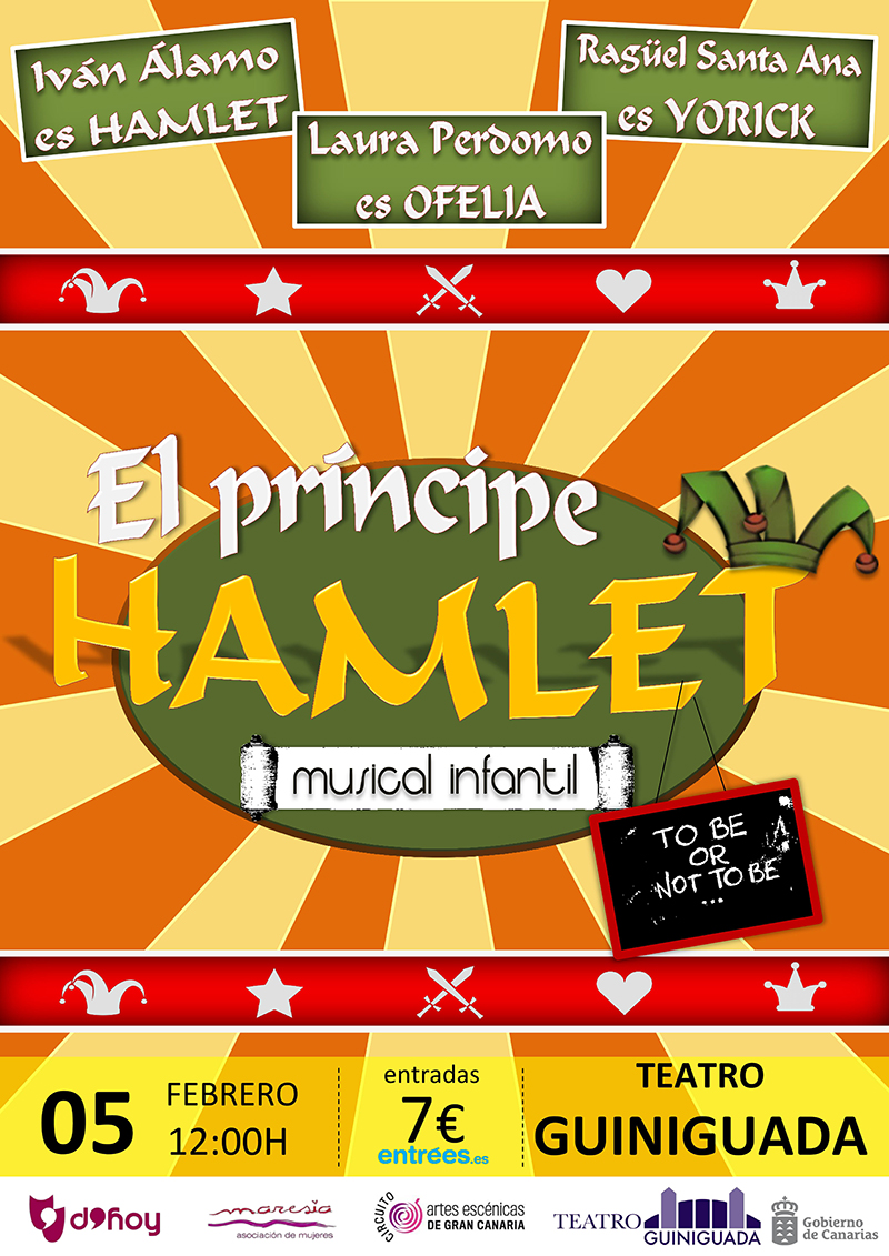 Después de tres años trabajando por y para la cultura canaria, D’hoy Teatro vuelve a sorprender una temporada más con su peculiar versión musical del clásico Hamlet de William Shakespeare. Este nuevo montaje recoge la excitante aventura del niño Hamlet que, junto a sus más fieles amigos Ofelia y Yorick, tendrá que recuperar el trono que su tío Claudio le ha robado a su padre. La espontaneidad y el juego con el público asistente serán claves principales para la función, por eso la compañía avisa: ‘ven preparado para jugar con nosotros’.