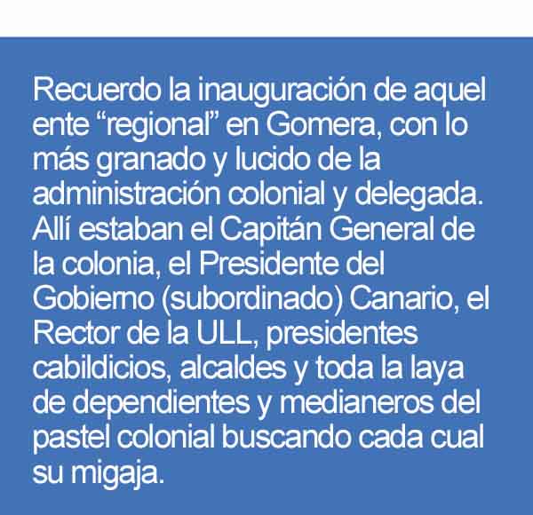 ¡Toma ya! Recuerdo la inauguración de aquel ente “regional” en Gomera, con lo más granado y lucido de la administración colonial y delegada. Allí estaban el Capitán General de la colonia, el Presidente del Gobierno (subordinado) Canario, el Rector de la ULL, presidentes cabildicios, alcaldes y toda la laya de dependientes y medianeros del pastel colonial buscando cada cual su migaja. Hablaron el ya fenecido Gumersindo Trujillo –gomero de pro que, por lo que allí dijo, bien podría ser de Fregenal de la Sierra o de Madrigal de las Alta Torres- y Jerónimo Saavedra, idem, eadem idem. De todo aquello salió…Agua de Borrajas.
