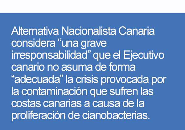 Alternativa Nacionalista Canaria considera “una grave irresponsabilidad” que el Ejecutivo canario no asuma de forma “adecuada” la crisis provocada por la contaminación que sufren las costas canarias a causa de la proliferación de cianobacterias. Para la organización soberanista canaria, “Clavijo se las da, ahora, de científico, y resulta escandaloso que sus únicas declaraciones sobre la crisis de las microalgas sean para tratar de silenciar a la opinión pública canaria y a los medios de comunicación”.
