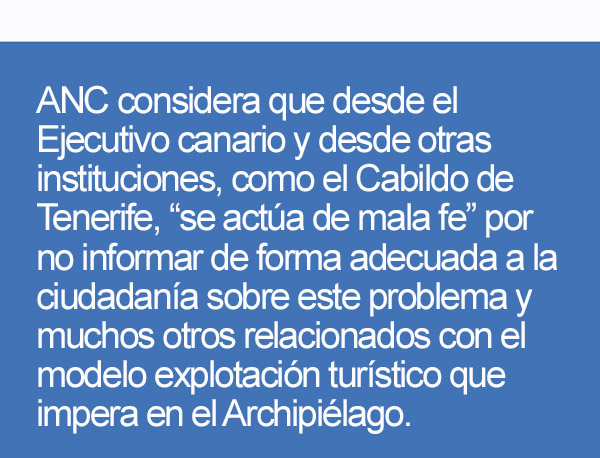 ANC considera que desde el Ejecutivo canario y desde otras instituciones, como el Cabildo de Tenerife, “se actúa de mala fe” por no informar de forma adecuada a la ciudadanía sobre este problema y muchos otros relacionados con el modelo explotación turístico que impera en el Archipiélago. Según aseveran, se estaría negando a la sociedad canaria la posibilidad de tener un debate serio sobre el modelo económico, al tiempo que se sacrifican, “de forma irreversible”, los recursos naturales y se mantiene la más absoluta precariedad laboral en el sector turístico. De hecho, para ANC la sobreexplotación del medio y la explotación laboral serían “las dos caras de un modelo económico que -entre otra cosas- mantiene a gran parte de la población de las Islas en la pobreza”.