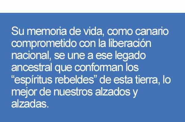 de enero del 2014 se convirtió en un “hasta siempre”. Su memoria de vida, como canario comprometido con la liberación nacional, se une a ese legado ancestral que conforman los “espíritus rebeldes” de esta tierra, lo mejor de nuestros alzados y alzadas. Forma parte de aquellos y aquellas que nunca morirán porque son la raíz reminiscente que nos sustenta, dado que ellos y ellas son los que dan sentido a esta matria canaria.