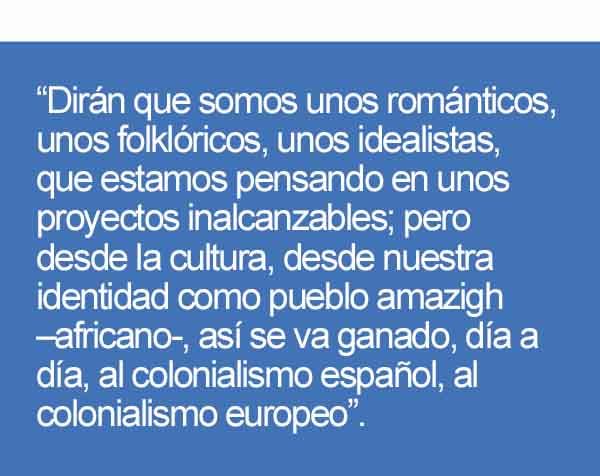 En sus propias palabras, en el homenaje que se le hacía en el Beñesmer 2008, Morongo definía su constancia y su compromiso: “Dirán que somos unos románticos, unos folklóricos, unos idealistas, que estamos pensando en unos proyectos inalcanzables; pero desde la cultura, desde nuestra identidad como pueblo amazigh –africano-, así se va ganado, día a día, al colonialismo español, al colonialismo europeo”.