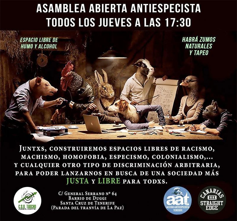 Por ello hemos organizado desde Acción Antiespecista de Tenerife y Canarias Straight Edge, las Asambleas AntiEspecistas. Donde desde la participación del mayor número de personas posible, intentaremos entre todxs poner sobre la mesa propuestas para combatir esta discriminación junto con el resto de discriminaciones.