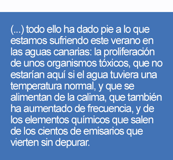 Pues bien, todo ello ha dado pie a lo que estamos sufriendo este verano en las aguas canarias: la proliferación de unos organismos tóxicos, que no estarían aquí si el agua tuviera una temperatura normal, y que se alimentan de la calima, que también ha aumentado de frecuencia, y de los elementos químicos que salen de los cientos de emisarios que vierten sin depurar.