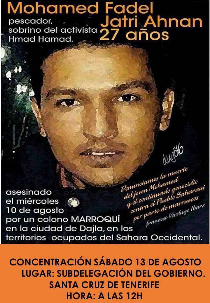 A Mohamed Fadel uld Jatri le quitaron la vida ayer a los 27 años en su tierra, lo asesinó un colono marroquí ( que aún sigue libre) en Dajla. Este crimen no es un caso aislado, solo tenemos que acordarnos de muchxs compañerxs que han sido asesinadxs en las mismas circunstancias estos últimos años, esta historia se repite una y otra vez en los territorios ocupados del Sahara. Marruecos quiere exterminar a la población saharaui, y nosotrxs no podemos permitir esta impunidad, tanto de colonos marroquíes como de la autoridad marroquí. Por ello, la plataforma de apoyo al pueblo saharaui y el movimiento canario de apoyo al pueblo saharaui convocan con carácter de urgencia una concentración en frente de la subdelegación del gobierno de Sc de Tenerife, a las 12 horas para denunciar estos asesinatos, y demostrarle al pueblo saharaui que en esta lucha no están solxs, y que si Canarias y el Sahara juntan las manos, el camino hacia la justicia y la libertad será cada vez más corto.