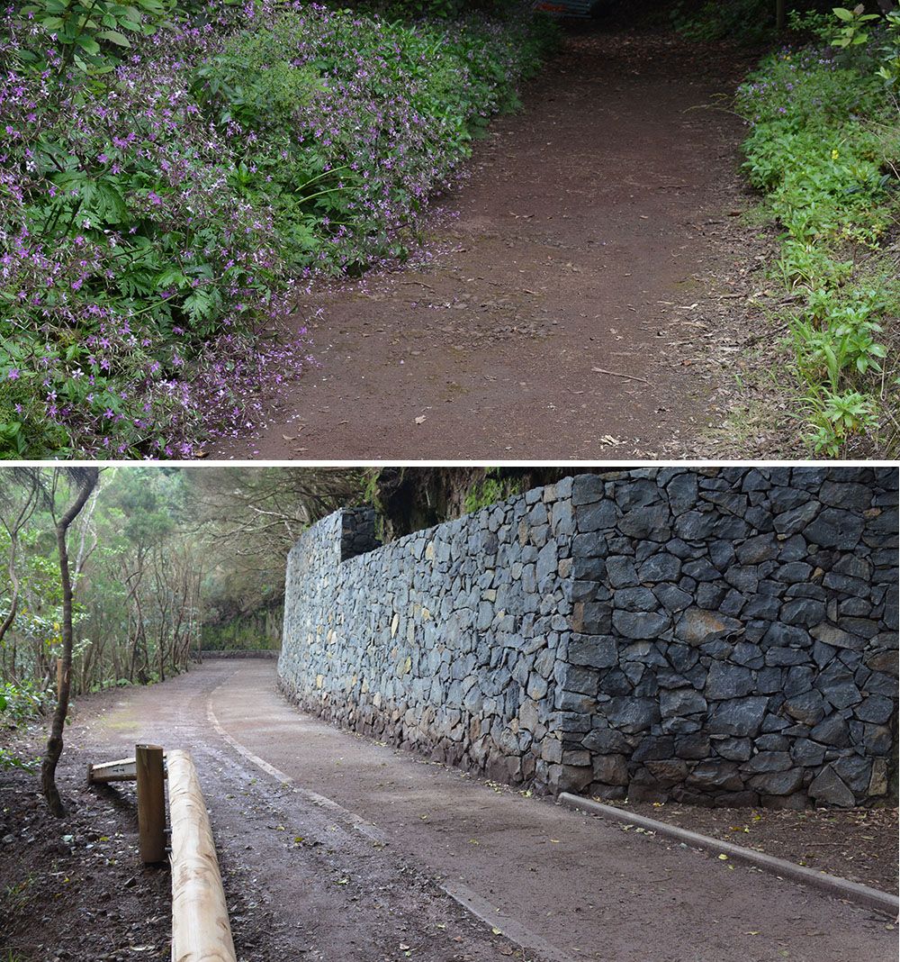 Bueno, puede ser, algunos consideramos sin embargo que abrir una zanja en ese espectacular pequeño pie de monte que por décadas se había formado ahí, rellenarla de hormigón y piedras, levantar un muro sin sentido y utilizar esas decenas de toneladas de material biológico de extraordinario valor como relleno para la pista, para que entre todos lo pisoteemos, es un hecho sin precedentes (no es cierto que en Monte del Agua se haya hecho eso) y que nos da la medida de la talla intelectual y moral de quienes toman ese tipo de decisiones amparándose en una supuesta accesibilidad que no es tal y que, en todo caso, serán las personas de movilidad reducida las primeras discriminadas con este tipo de actuaciones que les transforma de manera tan radical el propio entorno del que se supone debían disfrutar.