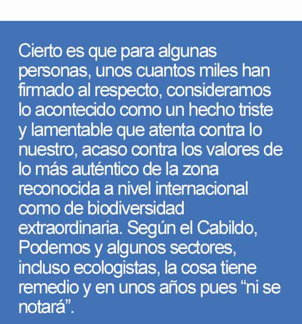 Cierto es que para algunas personas, unos cuantos miles han firmado al respecto, consideramos lo acontecido como un hecho triste y lamentable que atenta contra lo nuestro, acaso contra los valores de lo más auténtico de la zona reconocida a nivel internacional como de biodiversidad extraordinaria. Según el Cabildo, Podemos y algunos sectores, incluso ecologistas, la cosa tiene remedio y en unos años pues “ni se notará”.
