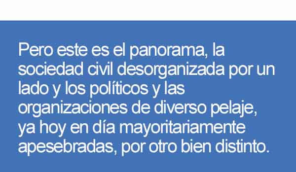 Pero ya les digo, eso es una forma de pensar, seguramente minoritaria sobre todo después de la agresiva campaña de descalificaciones, insinuaciones malintencionadas no sólo desde el gobierno insular sino incluso ¡oh sorpresa! por parte de quien se presenta a sí mismo como líder de la oposición. Pero este es el panorama, la sociedad civil desorganizada por un lado y los políticos y las organizaciones de diverso pelaje, ya hoy en día mayoritariamente apesebradas, por otro bien distinto.