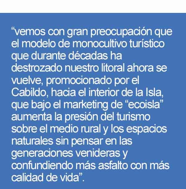 De esta forma: “vemos con gran preocupación que el modelo de monocultivo turístico que durante décadas ha destrozado nuestro litoral ahora se vuelve, promocionado por el Cabildo, hacia el interior de la Isla, que bajo el marketing de “ecoisla” aumenta la presión del turismo sobre el medio rural y los espacios naturales sin pensar en las generaciones venideras y confundiendo más asfalto con más calidad de vida”.