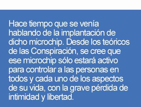 Hace tiempo que se venía hablando de la implantación de dicho microchip. Desde los teóricos de las Conspiración, se cree que ese microchip sólo estará activo para controlar a las personas en todos y cada uno de los aspectos de su vida, con la grave pérdida de intimidad y libertad.