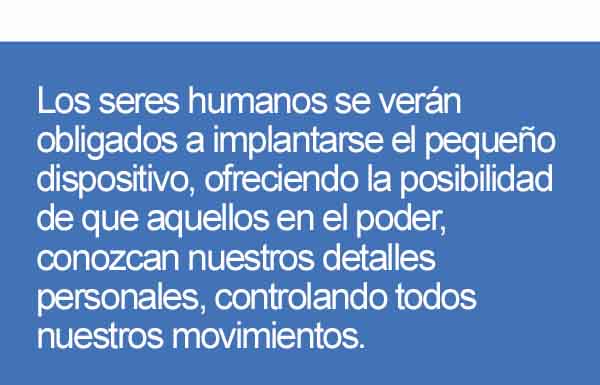 Los seres humanos se verán obligados a implantarse el pequeño dispositivo, ofreciendo la posibilidad de que aquellos en el poder, conozcan nuestros detalles personales, controlando todos nuestros movimientos.