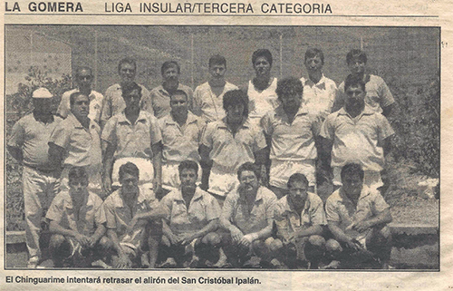 Así en la temporada 1992-1993 se celebra en La Gomera la primera liga y copa insular donde participan cuatro equipos: Chinguarime, Mulagua-Ganguila, Agana y San Cristóbal Ipalán. Muy poco se ha valorado el trabajo loable, constante y desinteresado de Miguel Chico y Javier Vera como organizadores de aquella liga. Otros quisieron colgarse las medallas.