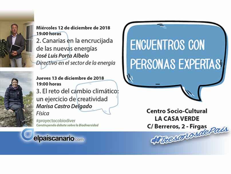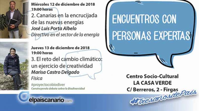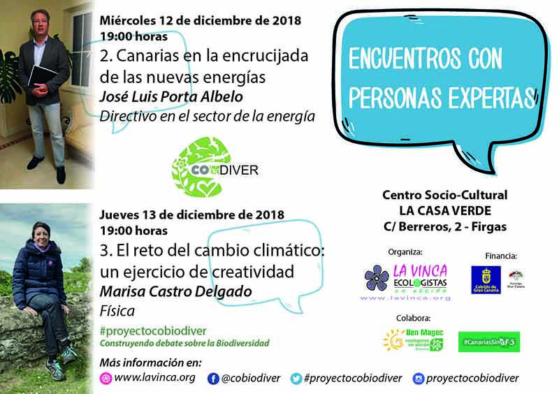 Esta novedosa propuesta participativa está incluida en el Proyecto “COBIODIVER – Construyendo Debate sobre la Biodiversidad”, organizada por el colectivo LA VINCA Ecologistas en Acción. Ambas sesiones se desarrollarán  en el Centro Socio-Cultural LA CASA VERDE (C/ Los Berreros, nº 2 – Firgas) y se contará como personas EXPERTAS para desarrollar cada uno de los temas con José Luis Porta (“Canarias en la encrucijada de las nuevas energías” – miércoles 12 DIC) y Marisa Castro (“El reto del cambio climático: un ejercicio de creatividad” – jueves 13 DIC), con el siguiente formato: