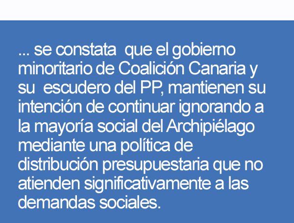 Tras la presentación de las cuentas para el 2018, se constata  que el gobierno minoritario de Coalición Canaria y su  escudero del PP, mantienen su intención de continuar ignorando a la mayoría social del Archipiélago mediante una política de distribución presupuestaria que no atienden significativamente a las demandas sociales.