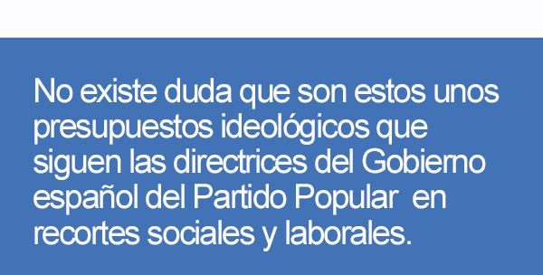 No existe duda que son estos unos presupuestos ideológicos que siguen las directrices del Gobierno español del Partido Popular  en recortes sociales y laborales. De tal forma, CC y el PP dan pábulo a la minoría enriquecida e ignora a la mayoría social. Se hace por lo tanto urgente medidas como la progresividad en  la política fiscal para que pague el que más tiene, el condicionar el importe del impuesto de sucesiones al nivel de la herencia, el gravarlos artículos de lujo, y además instaurar la imposición de una tasa turística que mejore la recaudación pública y promueva la protección de nuestros espacios naturales.