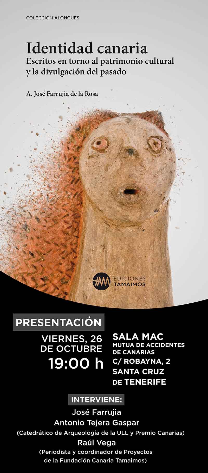 La Sala MAC (Mutua de Accidentes de Canarias) (C/ Robayna, 2) de Santa Cruz de Tenerife acoge la presentación en sociedad de Identidad canaria: Escritos en torno al patrimonio cultural y la divulgación del pasado de A. José Farrujia de la Rosa. Será el viernes 26 de octubre a las 19:00. En el acto acompañarán al autor Antonio Tejera Gaspar, Catedrático de Arqueología de la Universidad de La Laguna y Premio Canarias y Raúl Vega, periodista y Coordinador de Proyectos de la Fundación Canaria Tamaimos.