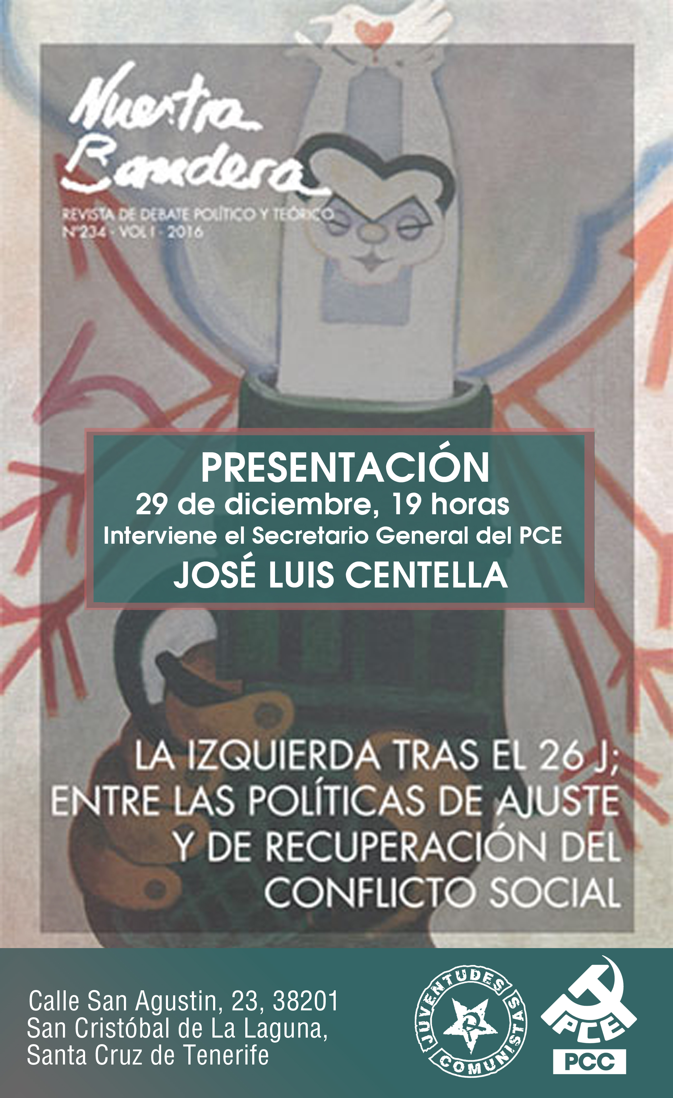 En la mesa, que abrirá un breve turno de debate al final de la presentación de Nuestra Bandera, estará el Secretario General del Partido Comunista de España (PCE), José Luis Centella y su homólogo en Canarias, Miguel Ángel Pérez Domínguez.