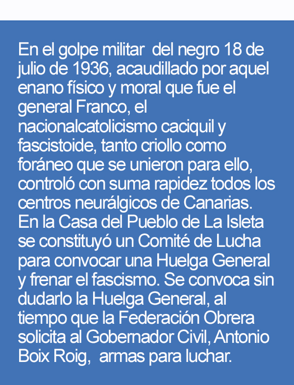 En el golpe militar del negro 18 de julio de 1936, acaudillado por aquel enano físico y moral que fue el general Franco, el nacionalcatolicismo caciquil y fascistoide, tanto criollo como foráneo que se unieron para ello, controló con suma rapidez todos los centros neurálgicos de Canarias. En la Casa del Pueblo de La Isleta se constituyó un Comité de Lucha para convocar una Huelga General y frenar el fascismo. Se convoca sin dudarlo la Huelga General, al tiempo que la Federación Obrera solicita al Gobernador Civil, Antonio Boix Roig, armas para luchar. Dada la temerosa posición ante la sublevación militar que mantuvo el gobernador que, apoyado por el Tte Coronel Jefe de la Guardia Civil en Las Palmas Emilio Baraibar Velasco, tuvo importantes ocasiones de impedir la salida de Franco desde Las Palmas y nunca aprovechó, timorata posición que pagaron con una condena a muerte en la causa 130/1936 que, afortunadamente para los condenados, no se cumplió, la entrega popular de armas fue totalmente denegada. Tampoco hubo el empuje popular suficiente para asaltar la Comandancia Militar frente a la que, en esos momentos, se concentraban algunos centenares de paisanos que fueron dispersados a tiros por el Ejército Español.
