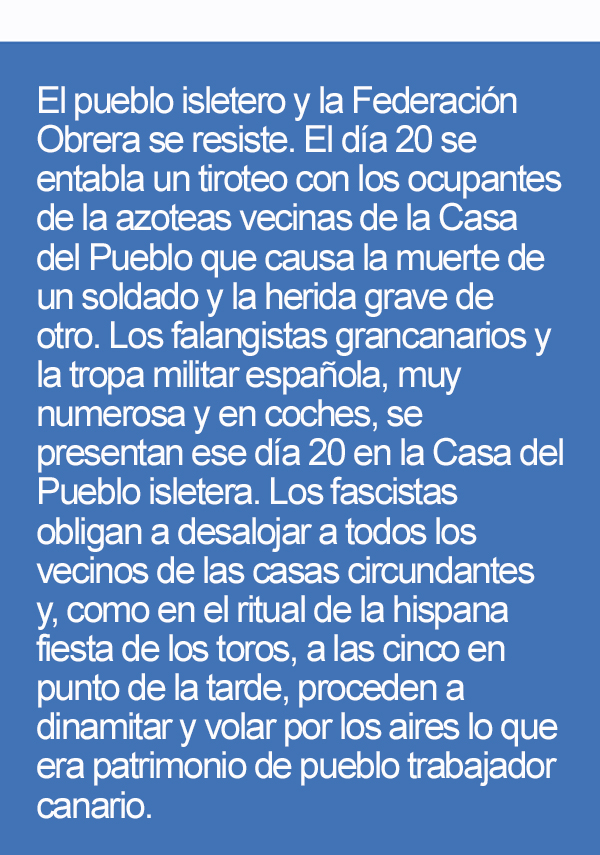El pueblo isletero y la Federación Obrera se resiste. El día 20 se entabla un tiroteo con los ocupantes de la azoteas vecinas de la Casa del Pueblo que causa la muerte de un soldado y la herida grave de otro. Los falangistas grancanarios y la tropa militar española, muy numerosa y en coches, se presentan ese día 20 en la Casa del Pueblo isletera. Los fascistas obligan a desalojar a todos los vecinos de las casas circundantes y, como en el ritual de la hispana fiesta de los toros, a las cinco en punto de la tarde, proceden a dinamitar y volar por los aires lo que era patrimonio de pueblo trabajador canario.