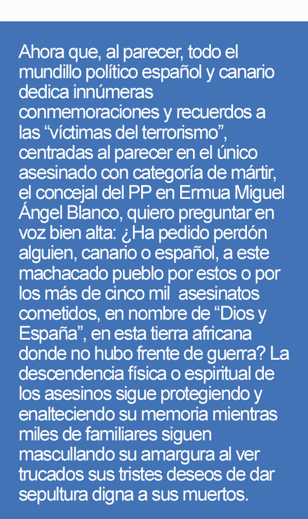Ahora que, al parecer, todo el mundillo político español y canario dedica innúmeras conmemoraciones y recuerdos a las “víctimas del terrorismo”, centradas al parecer en el único asesinado con categoría de mártir, el concejal del PP en Ermua Miguel Ángel Blanco, quiero preguntar en voz bien alta: ¿Ha pedido perdón alguien, canario o español, a este machacado pueblo por estos o por los más de cinco mil asesinatos cometidos, en nombre de “Dios y España”, en esta tierra africana donde no hubo frente de guerra? La descendencia física o espiritual de los asesinos sigue protegiendo y enalteciendo su memoria mientras miles de familiares siguen mascullando su amargura al ver trucados sus tristes deseos de dar sepultura digna a sus muertos.