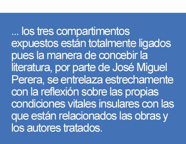 Sin embargo, los tres compartimentos expuestos están totalmente ligados pues la manera de concebir la literatura, por parte de José Miguel Perera, se entrelaza estrechamente con la reflexión sobre las propias condiciones vitales insulares con las que están relacionados las obras y los autores tratados. De similar modo pasa en el tratamiento de los temas de identidad, que en nada quedan separados de fuentes culturales de todo tipo (educativas, filosóficas, festivas, musicales…), entre ellas las literarias. Las lecturas finales de las obras desligadas del contexto insular (el filósofo Giorgio Agamben, el teólogo Leonardo Boff…) se hacen, según el punto de vista consciente planteado por el autor, desde aquí, o sea, son interpretaciones deliberadamente hechas desde una perspectiva canaria no como limitación, sino precisamente como un modo diferente y, por tanto, original, de focalizar los contenidos humanos tratados.