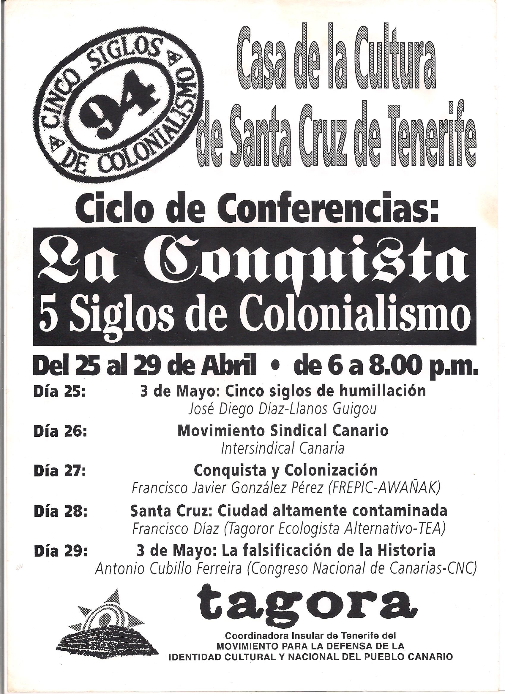 Aquel ciclo de conferencias de completó. Con las intervenciones de Antonio Cubillo, Francis Javier González, Francisco Díaz y alguien de Intersindical cuyo nombre no apareció en el cartel. Logramos salvar un poco de dignidad de los habitantes de esa ciudad y del resto de nuestra tierra, ante la posturita de monigotes traidores de nuestras propias instituciones, gobernadas ayer y hoy por ATI-CC.