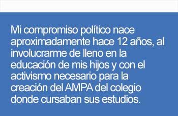 Mi compromiso  político nace aproximadamente hace 12 años, al involucrarme de lleno en la educación de mis hijos y con el activismo necesario para la creación del AMPA del colegio donde cursaban sus estudios. Ahí es  donde me doy cuenta de la problemática en la que está inmersa nuestra sociedad. Consecuentemente comienzo a acometer de una forma más cercana y vital los problemas; no sólo los educativos (falta de medios tecnológicos, comedor, aulas insuficientes, educación no acorde con nuestro entorno y cultura, etc.), sino también la problemática social que sufre la vecindad del entorno (paro, familias desestructuradas, escasez de recursos económicos, carencia de estudios, falta de integración en la comunidad, etc.). Descubro, al mismo tiempo, la desidia política y social que rodea todo ello, donde los organismos oficiales (incluido el Ayuntamiento) suelen dar largas a la solución de los problemas o dan la callada por  respuesta, como si la vida de las personas no mereciera el menor interés.