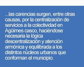 Las carencias surgen, entre otras causas, por la centralización de servicios a la colectividad en Agüimes casco, haciéndose necesaria la lógica descentralización y atención armónica y equilibrada a los distintos núcleos urbanos que conforman el municipio”