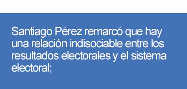 Santiago Pérez remarcó que hay una relación indisociable entre los resultados electorales y el sistema electoral; “y el ejercicio que han pretendido hacer los voceros del Régimen, desde los más cultos entre comillas hasta los más ignorantes o mercenarios, es intelectualmente inaceptable”.