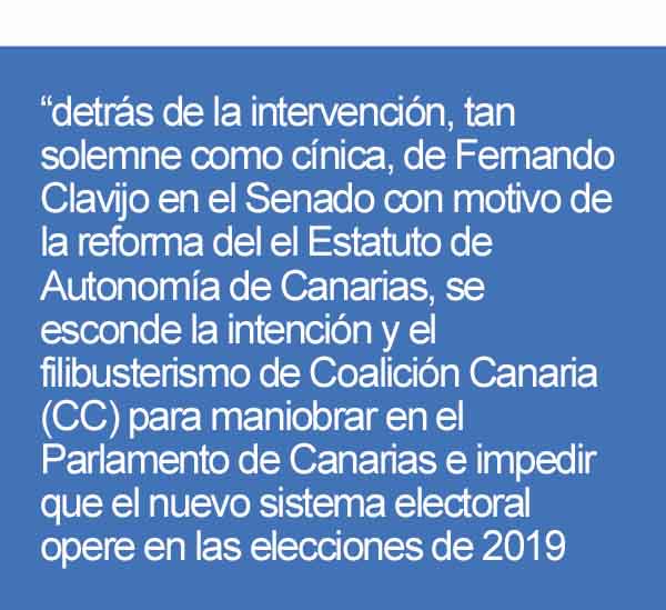 El concejal de La Laguna, Santiago Pérez, advierte de que “detrás de la intervención, tan solemne como cínica, de Fernando Clavijo en el Senado con motivo de la reforma del el Estatuto de Autonomía de Canarias, se esconde la intención y el filibusterismo de Coalición Canaria (CC) para maniobrar en el Parlamento de Canarias e impedir que el nuevo sistema electoral opere en las elecciones de 2019. Como si lo viera y clavijo”.