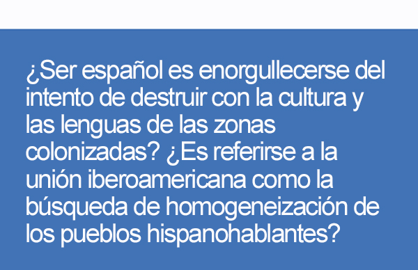¿Ser español es enorgullecerse del intento de destruir con la cultura y las lenguas de las zonas colonizadas? ¿Es referirse a la unión iberoamericana como la búsqueda de homogeneización de los pueblos hispanohablantes?
