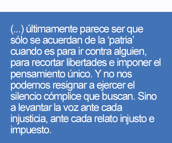 Dudar siempre es recomendable. Y yo seguiré dudando cada vez que vea cómo se enarbola la bandera roja y gualda para exaltar todo lo anteriormente mencionado. Porque últimamente parece ser que sólo se acuerdan de la ‘patria’ cuando es para ir contra alguien, para recortar libertades e imponer el pensamiento único. Y no nos podemos resignar a ejercer el silencio cómplice que buscan. Sino a levantar la voz ante cada injusticia, ante cada relato injusto e impuesto.