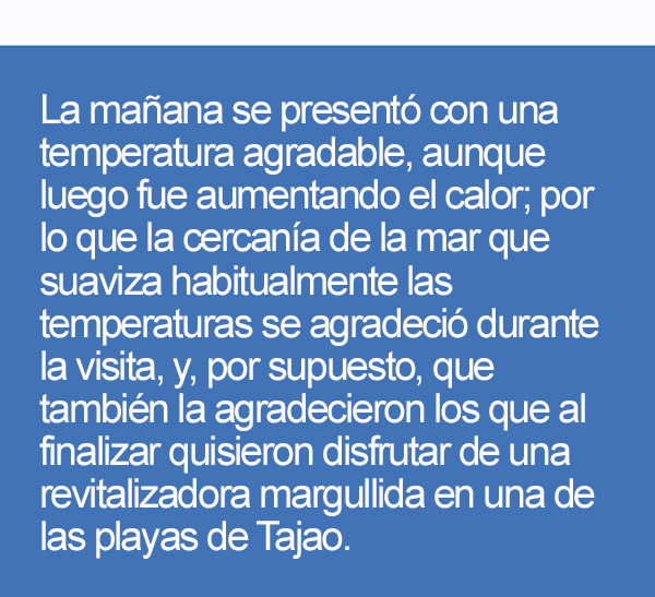 La mañana se presentó con una temperatura agradable, aunque luego fue aumentando el calor; por lo que la cercanía de la mar que suaviza habitualmente las temperaturas se agradeció durante la visita, y, por supuesto, que también la agradecieron los que al finalizar quisieron disfrutar de una revitalizadora margullida en una de las playas de Tajao.