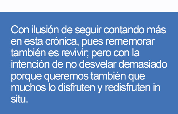 Con ilusión de seguir contando más en esta crónica, pues rememorar también es revivir; pero con la intención de no desvelar demasiado porque queremos también que muchos lo disfruten y redisfruten in situ.