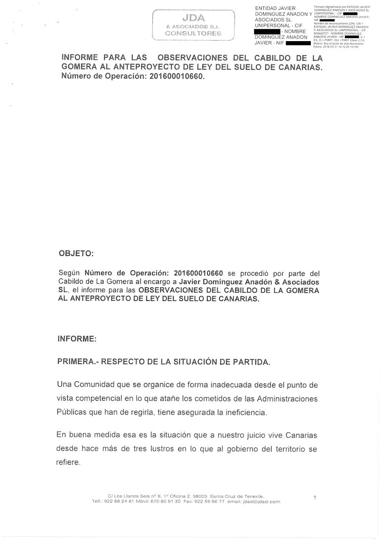 El informe presentado se trata de un encargo del Cabildo de La Gomera a la consultora JDA ASOCIADOS & S.L. CONSULTORES firmado por Javier Domínguez Anadón, conocido defensor del anteproyecto de Ley del Suelo. El informe presentado ante el Gobierno de Canarias conserva el encabezado de la consultora y la firma del redactor.