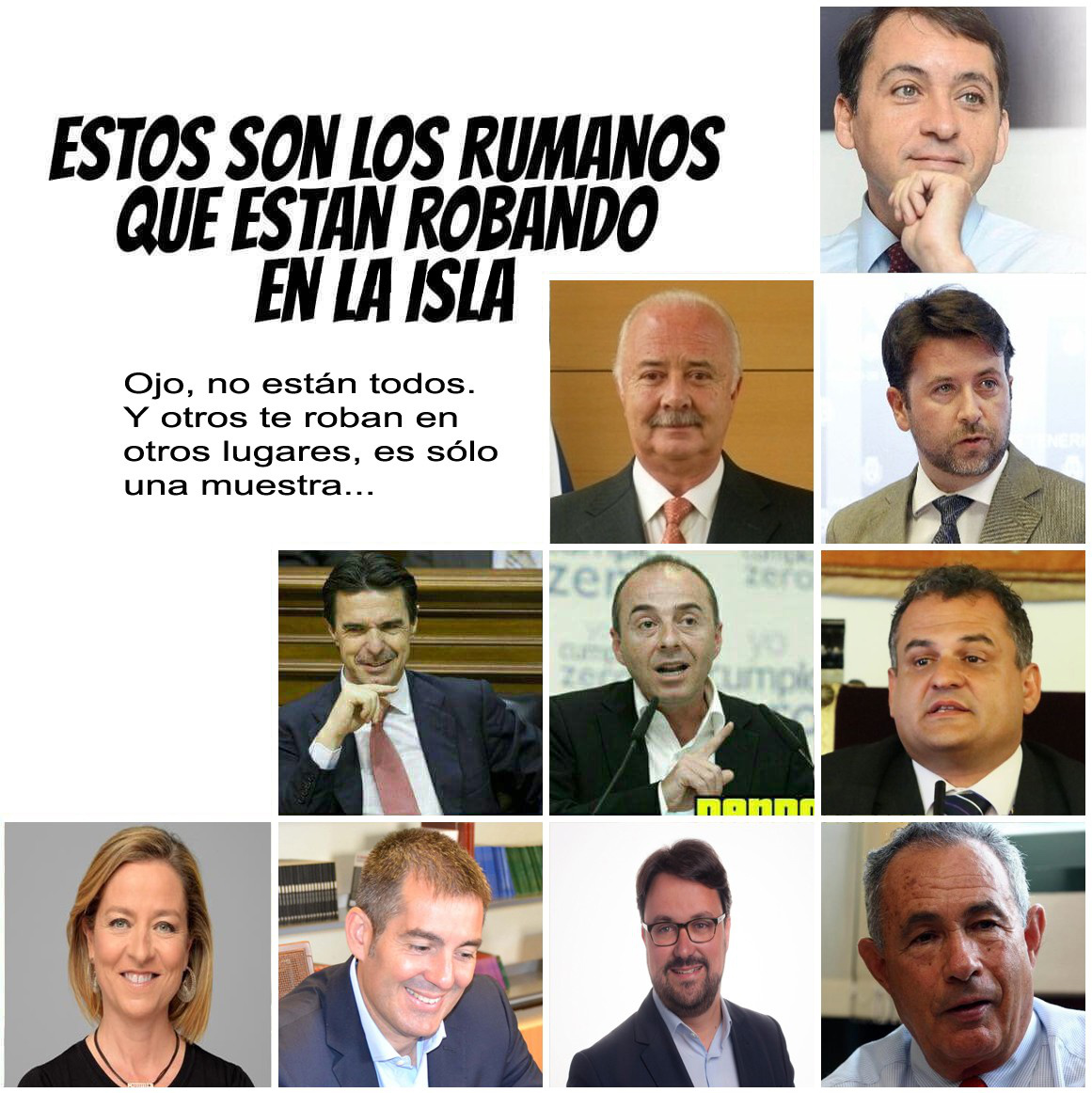 Tras cuatro décadas de Gobierno en supuesta democracia, en las que se debería haber acabado con la teocracia provinciana y caciquil del franquismo, con la desesperante hambre de Infraestructuras, Servicios, Trabajo, Educación, Sanidad, etc. que son endémicas de esta tierra, nos encontramos con que esta situación apenas ha cambiado y seguimos casi en la misma situación de siempre, percepción que tienen la ciudadanía aunque no se atrevan a manifestarlo públicamente. Porque esa es otra. Recientemente me encontré en el médico con alguien desconoci@ y tras una charla intrascendente, la cosa derivó hacia la situación actual. Me sentí casi conmocionado cuando esta persona, que viene del ámbito judicial me soltó la frase de que “y no digas nada porque encima te niegan hasta el trabajo poniéndote en una lista negra…” Me quedé de piedra, puesto que si hasta la gente “de dentro (Del Sistema)” tiene esa percepción, ¿Qué no podemos pensar los que sufrimos fuera de él? ¿De verdad acabó el franquismo y sus persecuciones, el uso del método de palo o golosina…? Quizá quienes ahora tengan menos de treinta años no sepan de qué va esto, y fueran necesarias montones de explicaciones y datos para demostrar que en el fondo aquí no ha cambiado nada tras cuatro décadas, pero los que aunque sea vagamente recordamos aquellos tiempos de penurias, hambre, corrupción política generalizada, paro, represión etc., no podemos más que preguntarnos si de verdad ha cambiado algo. La pasada semana me enviaron la foto del principio, y por más que uno sepa que no son rumanos sino gente de aquí, no puedo por menos que, a tenor de la exposición que acabo de hacer, preguntarme si los verdaderos rumanos que forman asociaciones para delinquir son más peligrosos para Canarias que esta cuadrilla….