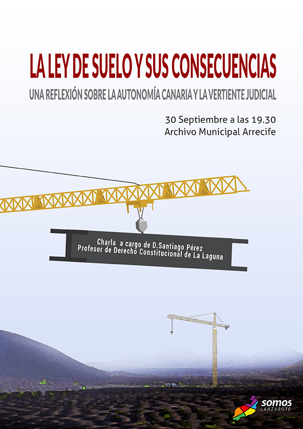 Lanzarote, 28 de septiembre de 2016.- La Ley de Suelo es de los temas más candentes en la actualidad política en las Islas Canarias. Somos Lanzarote entiende que es necesario seguir profundizando en su debate, conocimiento y consecuencias futuras. Para ello invita a toda la ciudadanía de Lanzarote a la conferencia- debate a cargo de D. Santiago Pérez que tendrá lugar el viernes 30 de octubre a las 19.30 horas en el Archivo Municipal de Arrecife. En esta se abordará la Ley de Suelo especialmente en lo relacionado con su aspecto jurídico, los efectos contra la Autonomía Canaria, y sus consecuencias inmediatas.