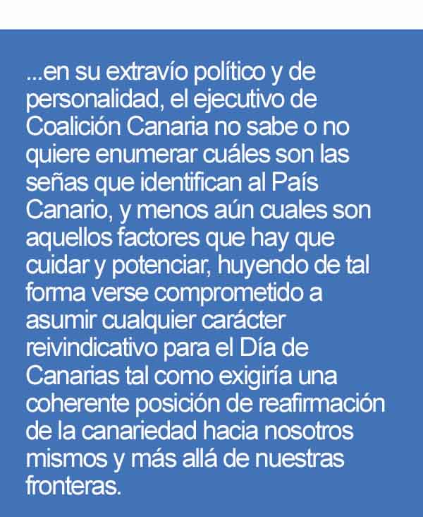 Ello nos lleva a pensar que en su extravío político y de personalidad, el ejecutivo de Coalición Canaria no sabe o no quiere enumerar cuáles son las señas que identifican al País Canario, y menos aún cuales son aquellos factores que hay que cuidar y potenciar, huyendo de tal forma verse comprometido a asumir cualquier carácter reivindicativo para el Día de Canarias tal como exigiría una coherente posición de reafirmación de la canariedad hacia nosotros mismos y más allá de nuestras fronteras.