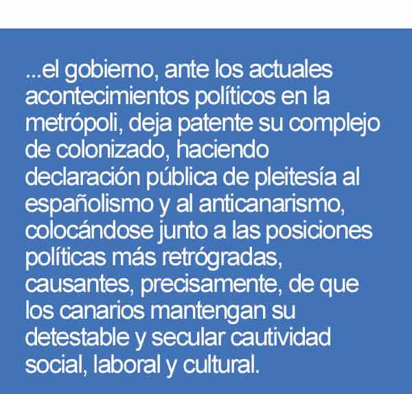 Muy al contrario de la defensa que le obliga en el pretendido día de los canarios, en vísperas del 30 de Mayo, el gobierno, ante los actuales acontecimientos políticos en la metrópoli, deja patente su complejo de colonizado, haciendo declaración pública de pleitesía al españolismo y al anticanarismo, colocándose junto a las posiciones políticas más retrógradas, causantes, precisamente, de que los canarios mantengan su detestable y secular cautividad social, laboral y cultural.