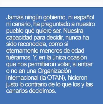 Jamás ningún gobierno, ni español ni canario, ha preguntado a nuestro pueblo qué quiere ser. Nuestra capacidad para decidir, nunca ha sido reconocida, como si eternamente menores de edad fuéramos. Y, en la única ocasión que nos permitieron votar, si entrar o no en una Organización Internacional (la OTAN), hicieron justo lo contrario de lo que los y las canarios decidimos.