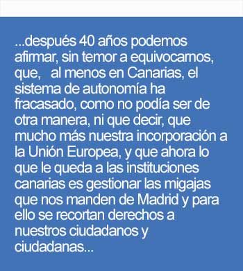 Por ello, después 40 años podemos afirmar, sin temor a equivocarnos, que, al menos en Canarias, el sistema de autonomía ha fracasado, como no podía ser de otra manera, ni que decir, que mucho más nuestra incorporación a la Unión Europea, y que ahora lo que le queda a las instituciones canarias es gestionar las migajas que nos manden de Madrid y para ello se recortan derechos a nuestros ciudadanos y ciudadanas, salarios a nuestros profesionales de las administraciones públicos (eso si nos quitan médicos y maestros y nos ponen policías) y todo ello se hace en función de los intereses de los capitales financieros que nada tienen que ver con los de la mayoría social de Canarias. Si tuviéramos un Gobierno Canario con dignidad diría que no gestiona la miseria, ni recorta salarios, ni aplica la reforma laboral, ni sube impuestos que afecten a la cesta de la compra, ni… Pero como no lo tenemos hay que evidenciar su ineficacia y su traición a Canarias. Ese mismo Fernando Clavijo que ha recorrido todo tipo de pasillos españoles y europeos para mantener los privilegios y exenciones fiscales del REF con su Reserva de Inversiones de Canarias (esa fórmula de evasión de capitales made in Canarias), en su reciente estrenado nuevo Estatuto de Autonomía, no lo hemos visto hacer lo mismo para que se respeten los derechos sociales de la mayoría de la población del archipiélago, por ejemplo, a través del reconocimiento en el mismo de un Marco Propio de Relaciones Laborales que posibilite, entre otras cosas, la no aplicación en nuestra patria de las sucesivas reformas laborales.