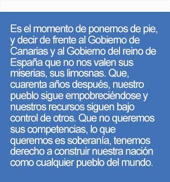 Es el momento de ponernos de pie, y decir de frente al Gobierno de Canarias y al Gobierno del reino de España que no nos valen sus miserias, sus limosnas. Que, cuarenta años después, nuestro pueblo sigue empobreciéndose y nuestros recursos siguen bajo control de otros. Que no queremos sus competencias, lo que queremos es soberanía, tenemos derecho a construir nuestra nación como cualquier pueblo del mundo.